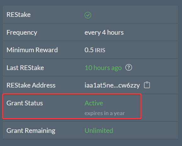 **By enabling restaking, all your IRIS rewards from staking will be automatically delegated to your staking balance once you reach the minimum required reward (0.5 IRIS).**