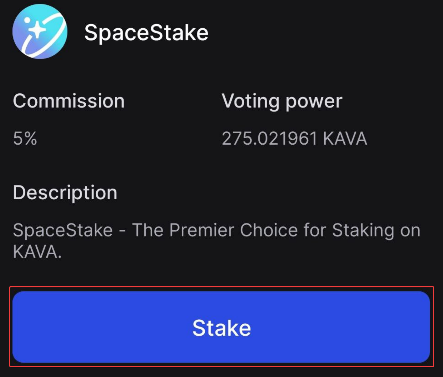 * SpaceStake validator address: `kavavaloper1hj99pyu4pyun8p22pyd8nu5v5g2rdd2l0d5c5z`